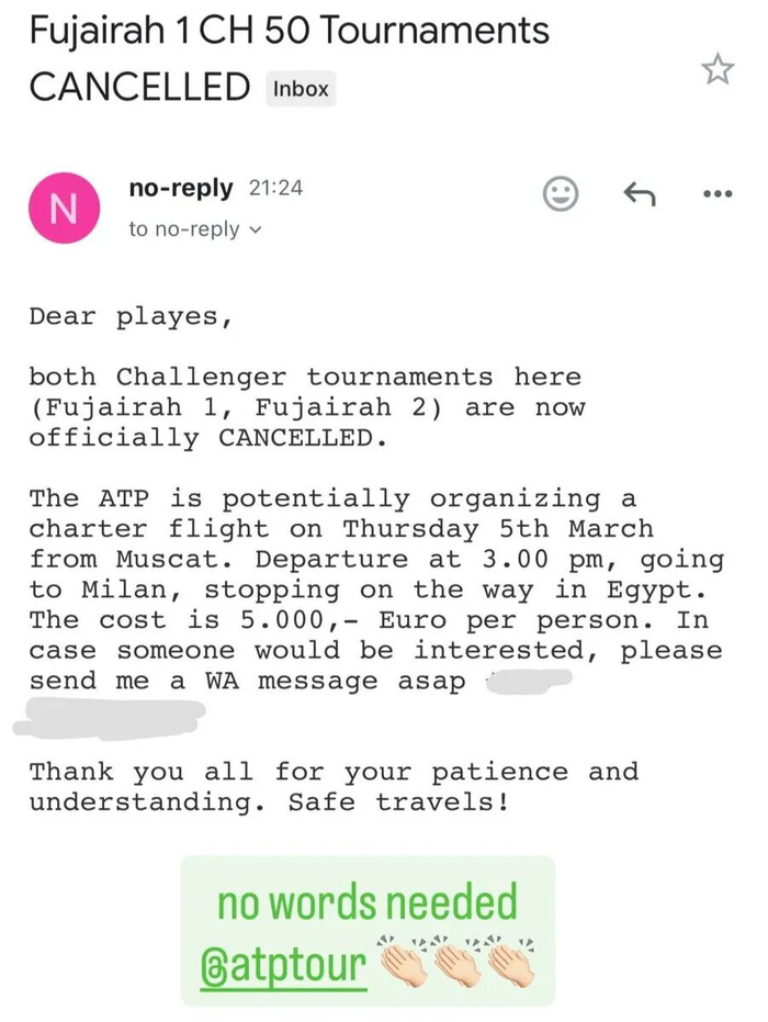 赛事取消后,如何安全疏散滞留当地的球员成为当务之急,两位中国球员孙发京和周意也在其中,孙发京在其个人社交媒体更新动态,戏称自己为“战地运动员”。参赛选手伊瓦什卡在社交媒体上透露,ATP正协调安排包机协助所有人员撤离,计划于3月5日(周四)从马斯喀特起飞,经停埃及后飞往米兰。然而,每位需要乘坐该航班的人员需要承担高达5000欧元(约4万人民币)的包机费用。