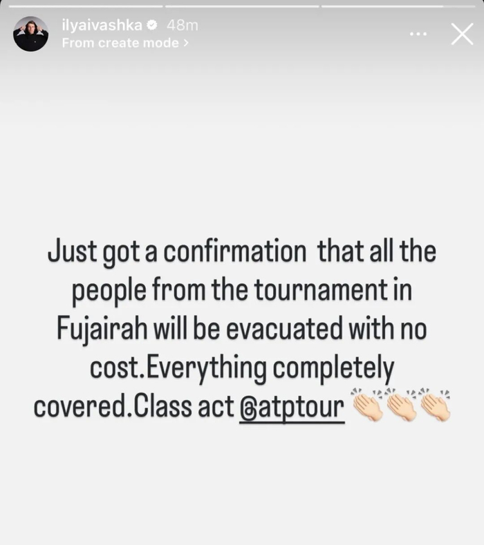 令人欣慰的是,这一情况很快迎来转机。参赛选手伊瓦什卡在北京时间昨晚更新个人社交媒体,透露ATP将全额承担所有球员的撤离费用,这意味着身处动荡地区的球员无需再自掏腰包,即可安全离开。
