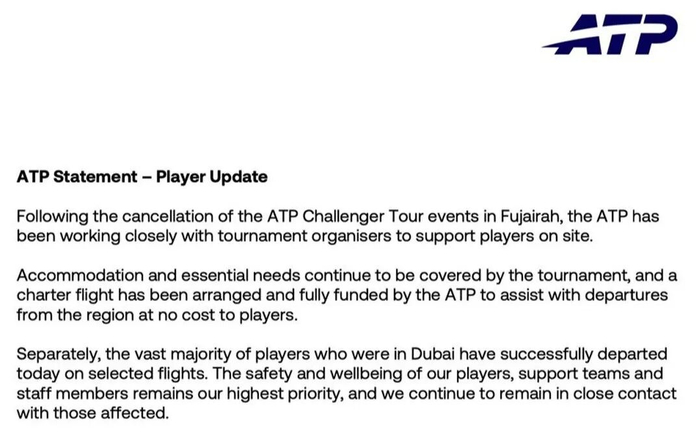 ATP随后发布正式声明,强调将继续全力保障球员及工作人员的安全:“富查伊拉挑战赛取消后,ATP与赛事组织者保持紧密协作,为现场球员提供支持。赛事方继续提供住宿及基本生活保障,ATP安排并全额资助包机,帮助球员免费撤离该地区。同时,目前身处迪拜的绝大多数球员已于当日顺利搭乘指定航班离开。球员、支持团队及工作人员的安全与福祉始终是我们的首要任务,我们将持续与受影响人员保持密切联系。”